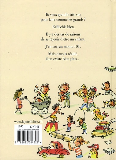 Tu veux grandir très vite pour faire comme les grands? Réfléchis bien. Il y a des tas de raisons de se réjouir d’être un enfant. J’en vois au moins 101. Mais dans la réalité, il en existe bien plus….