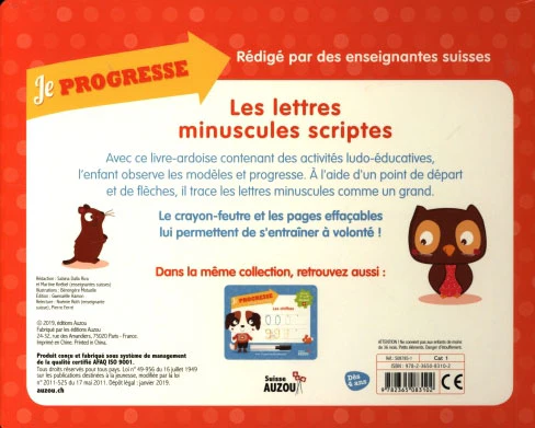 Ce livre-ardoise est livré avec un crayon effaçable permettant de refaire et de refaire les lettres minuscules scriptes et de bien comprendre le sens de la graphie pour chacune des lettres de l’alphabet.