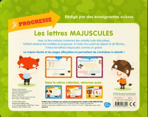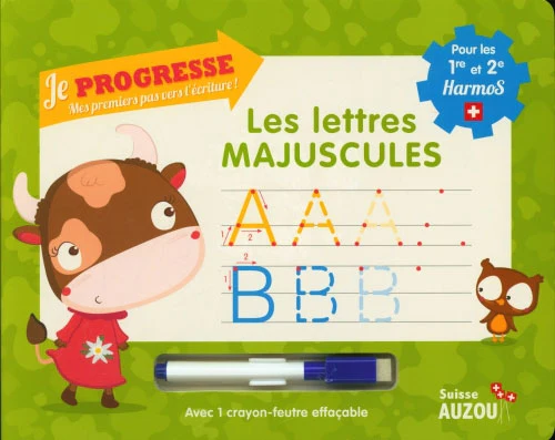 Avec ce livre-ardoise votre enfant qui démarre la 1ère ou la 2ème harmos pourra s’entraîner à bien tracer et dessiner les lettres majuscules.