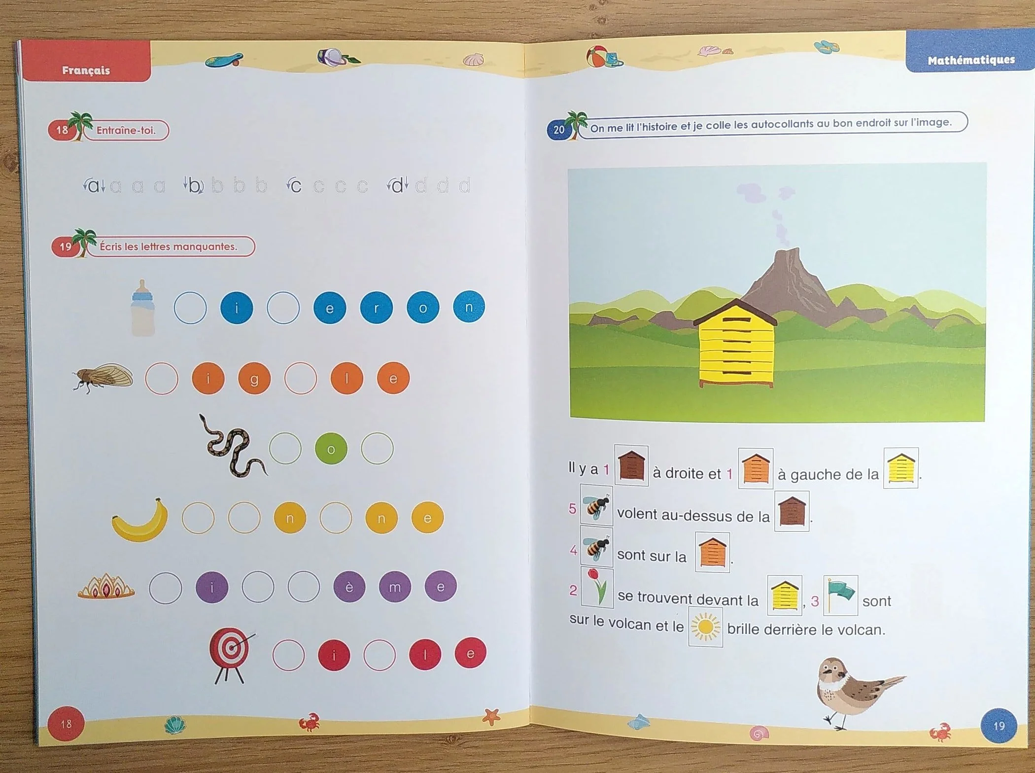 Cahier de vacances comprenant des jeux pour familiariser l’enfant aux notions de lettres et de chiffres.
