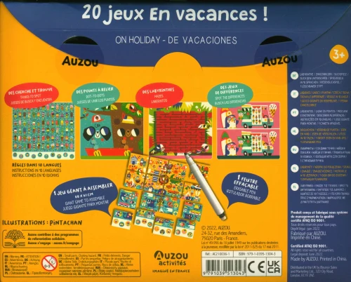 Des planches de jeux sur le thème des vacances Amuses-toi en vacances avec ta pochette contenant 20 jeux ! Relie des points, cherche et trouve, trouve des différences, résous des labyrinthes et même découvre un grand cherche et trouve à reconstituer ! Nombre de pages : 22 Format : 221/195/8 mm