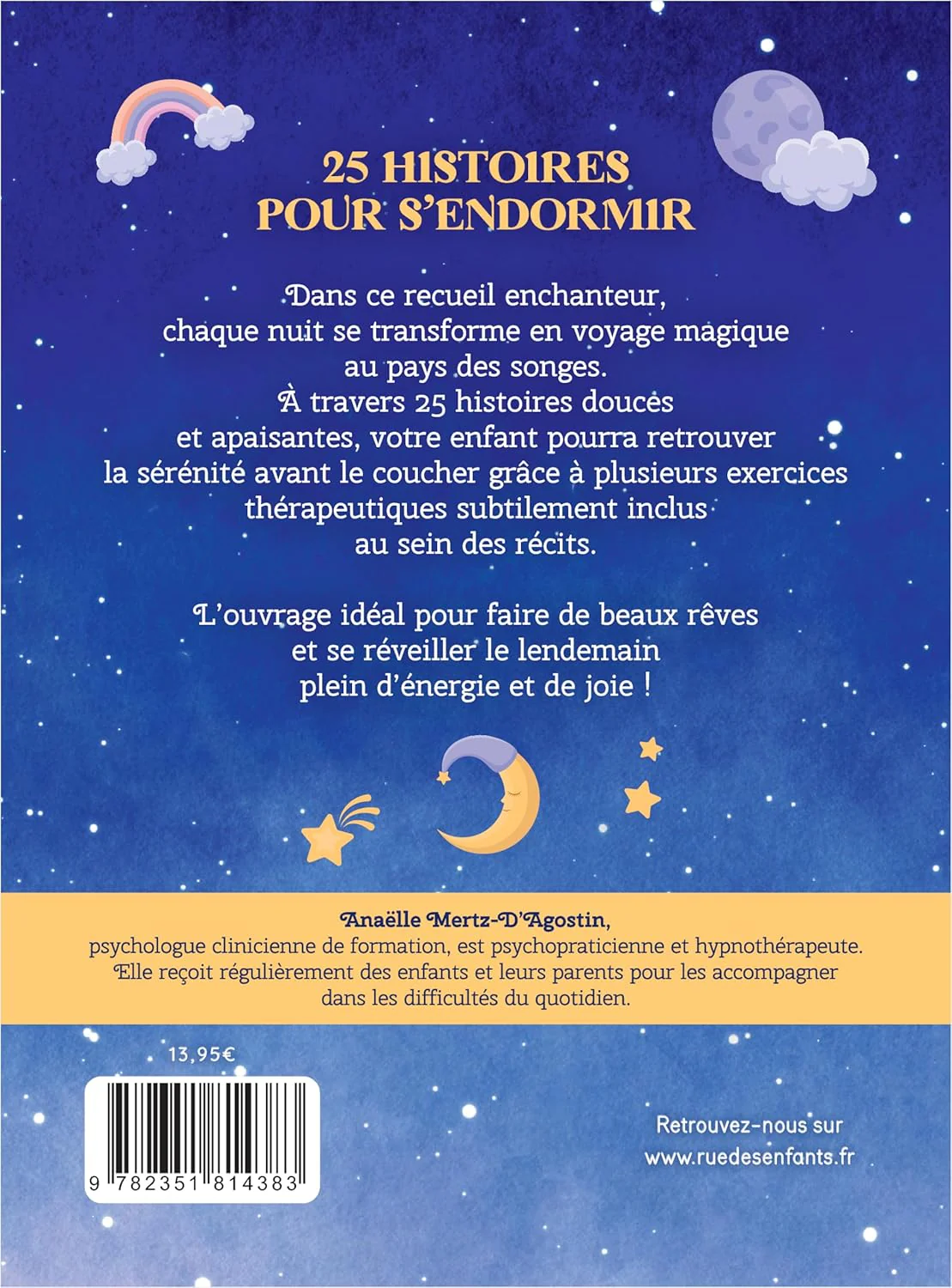 Écrit par une hypnothérapeute, cet ouvrage permettra à l’enfant de s’apaiser avant le coucher grâce à plusieurs exercices de respiration et de visualisation habilement inclus dans les 25 histoires proposées dans ce recueil.
