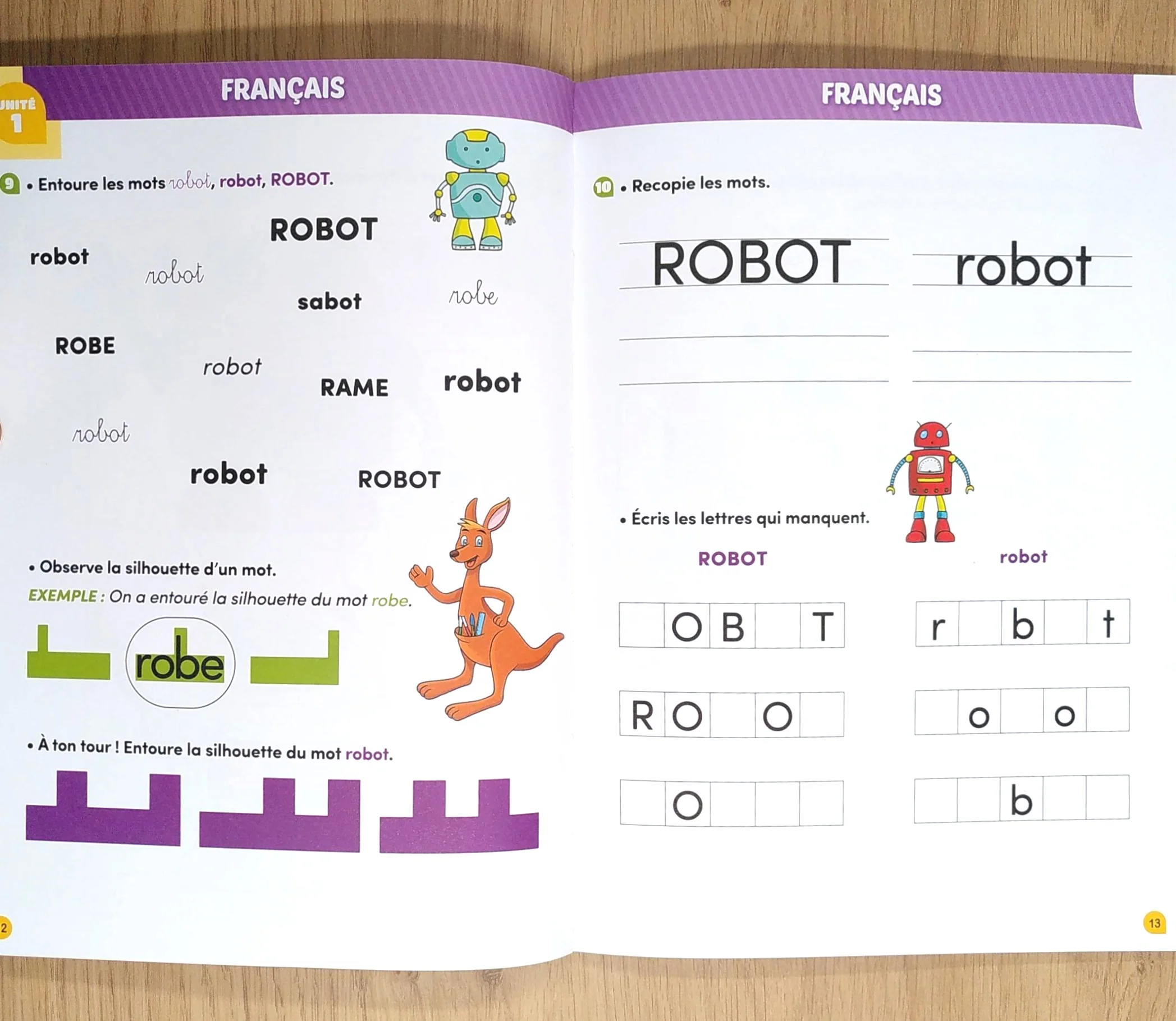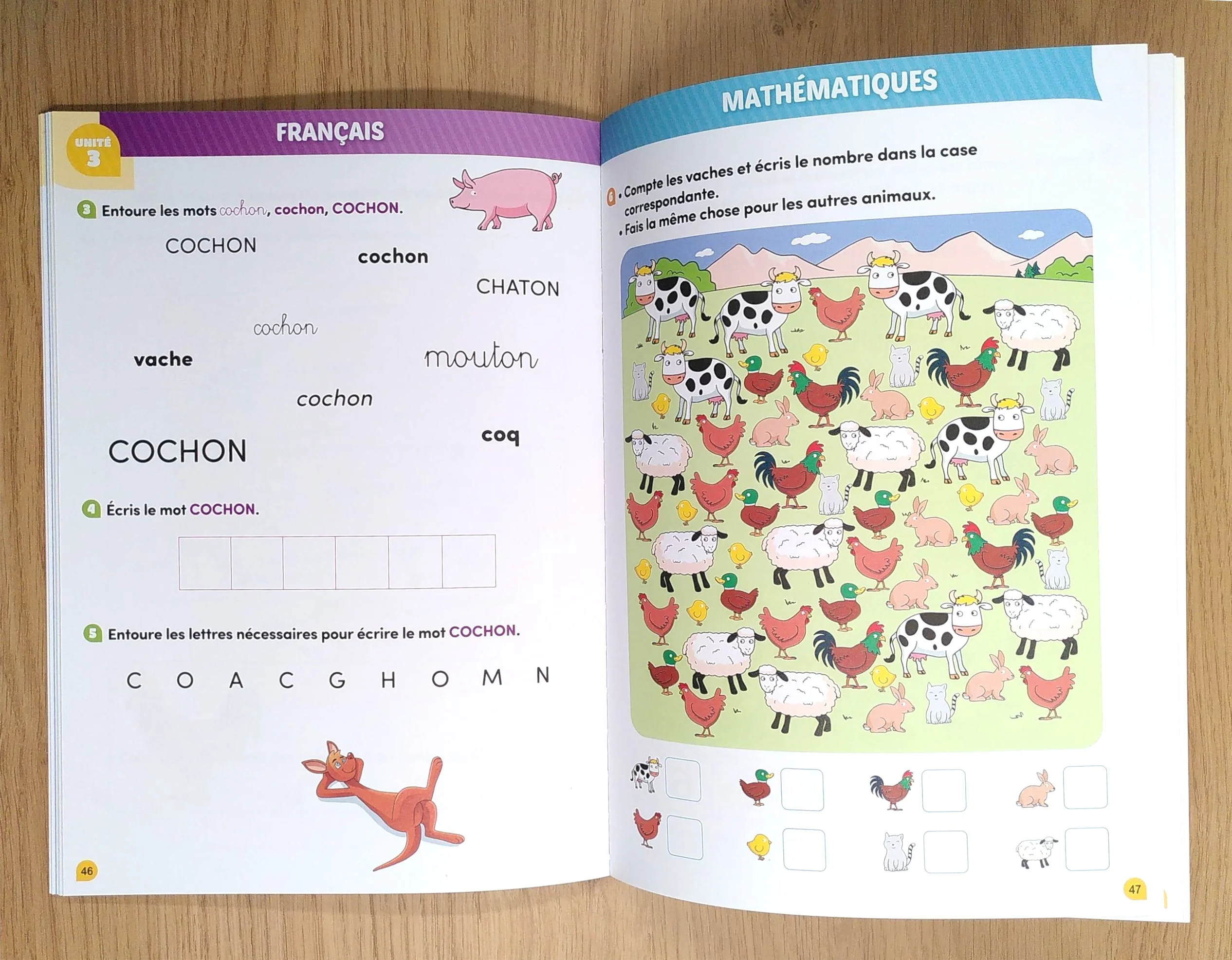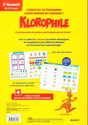 Klorophile propose aux enfants de 5 à 6 ans, un gros cahier de soutien scolaire de 76 pages pour faire des exercices de français, d’écriture et de maths ainsi que des jeux basés sur le programme romand de 2ème.