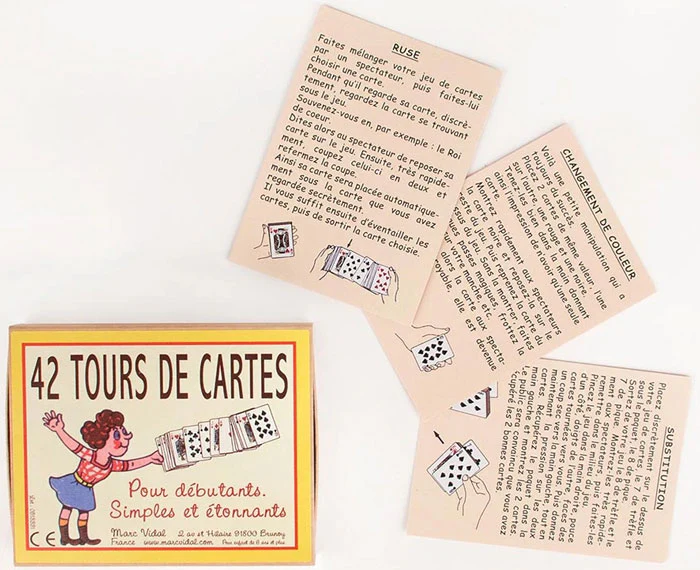Cette très jolie boite en carton bien rétro contient 42 tours de cartes pour débutants, simples et étonnants. Des tours de cartes classiques, adaptés aux débutants, mais qui ont toujours autant de succès ! Ils mélangent adresse, habileté, entraînement et persévérance et sont un excellent moyen pour développer imagination et créativité.
