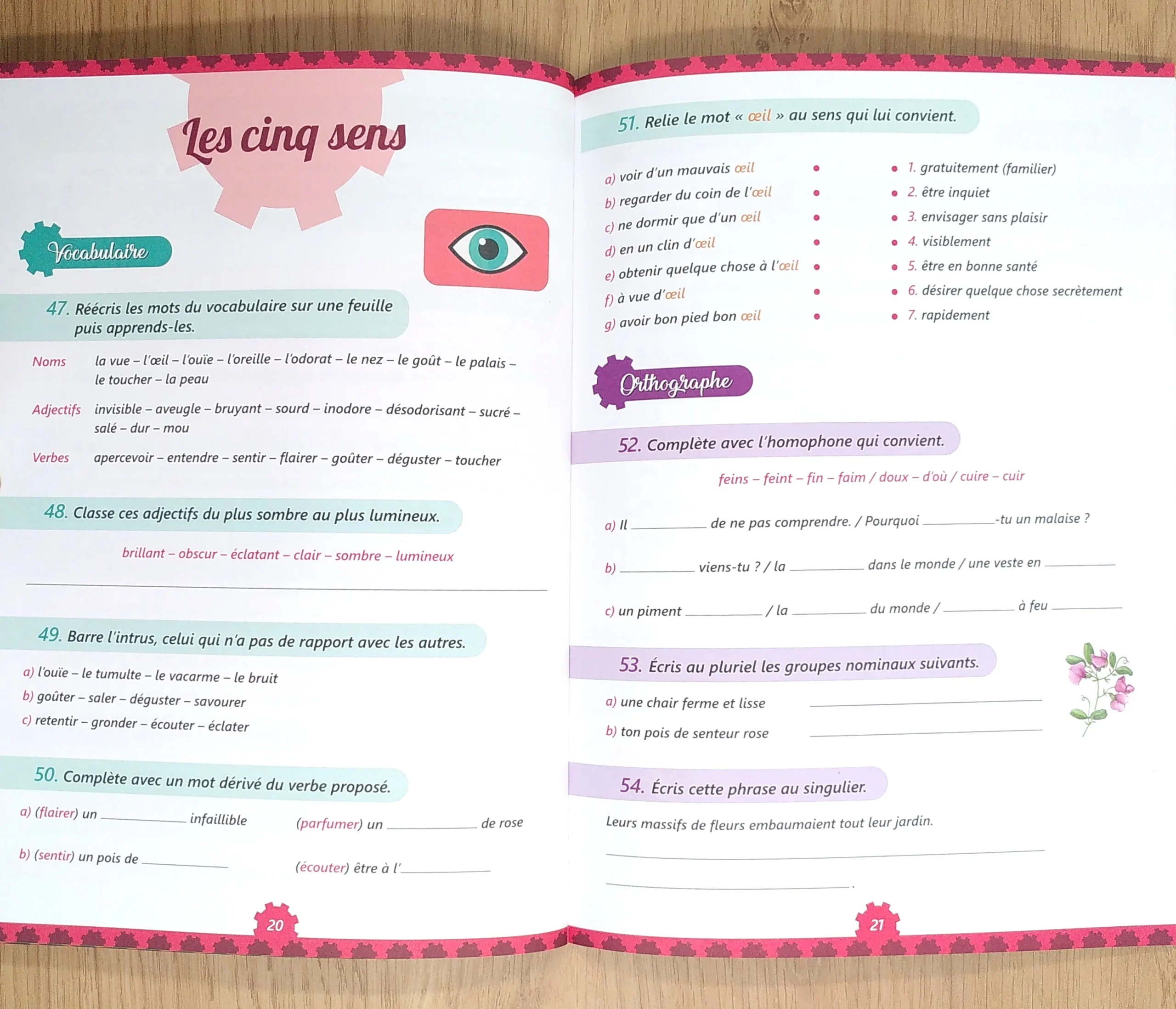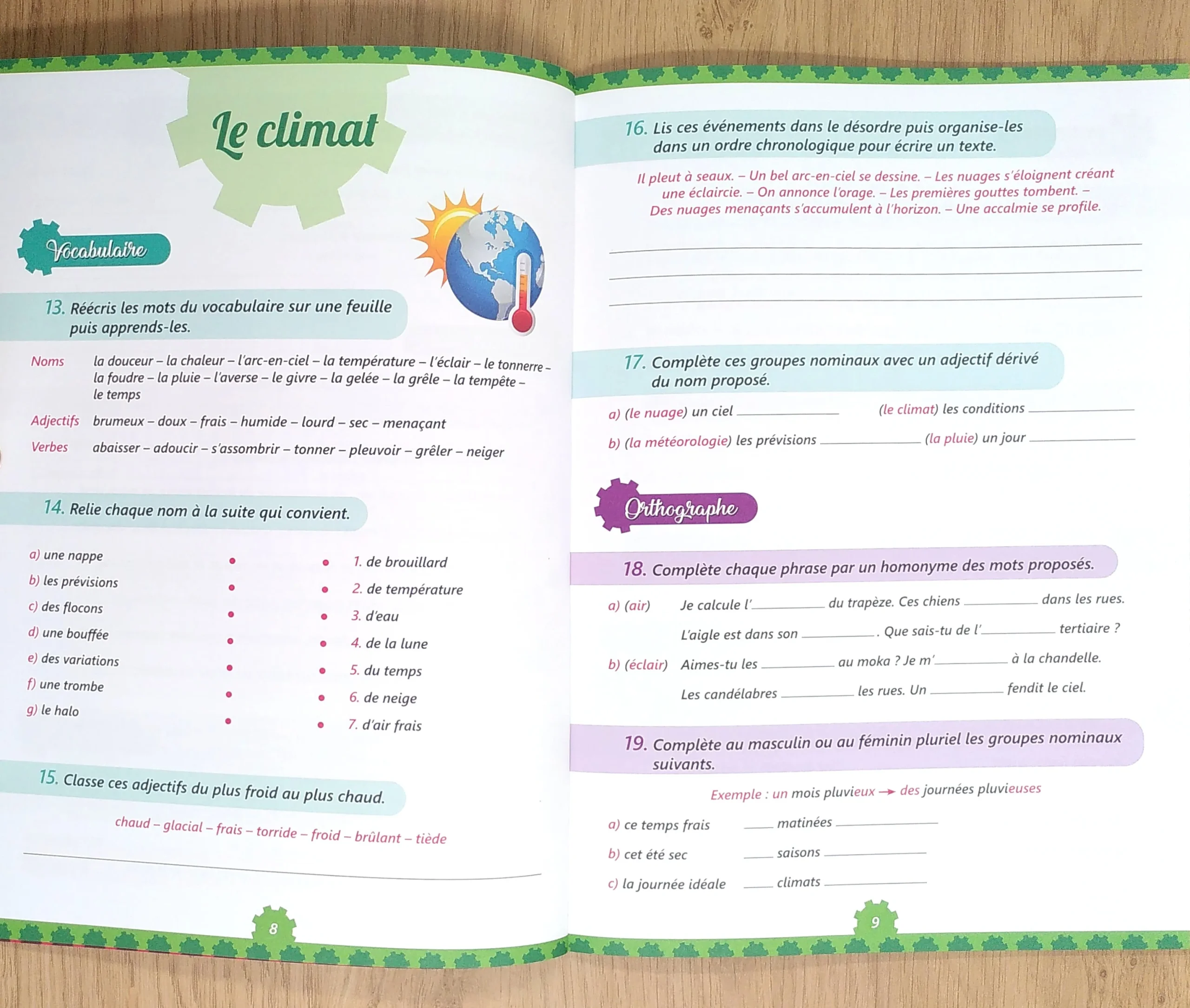 Son objectif: renforcer avec des révisions ciblées les règles d’orthographe, de grammaire et de conjugaison, par le biais d’exercices variés. Ce cahier permet également d’élargir le champ lexical de l’élève.