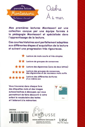 Mes Premières lectures Montessori est une collection conçue par une équipe d’orthophonistes spécialistes de la pédagogie Montessori. Elle propose de courtes histoires adaptées à la progression de l’enfant dès 5 ans (dès qu’il connait le son des lettres) , avec 5 niveaux très progressifs.