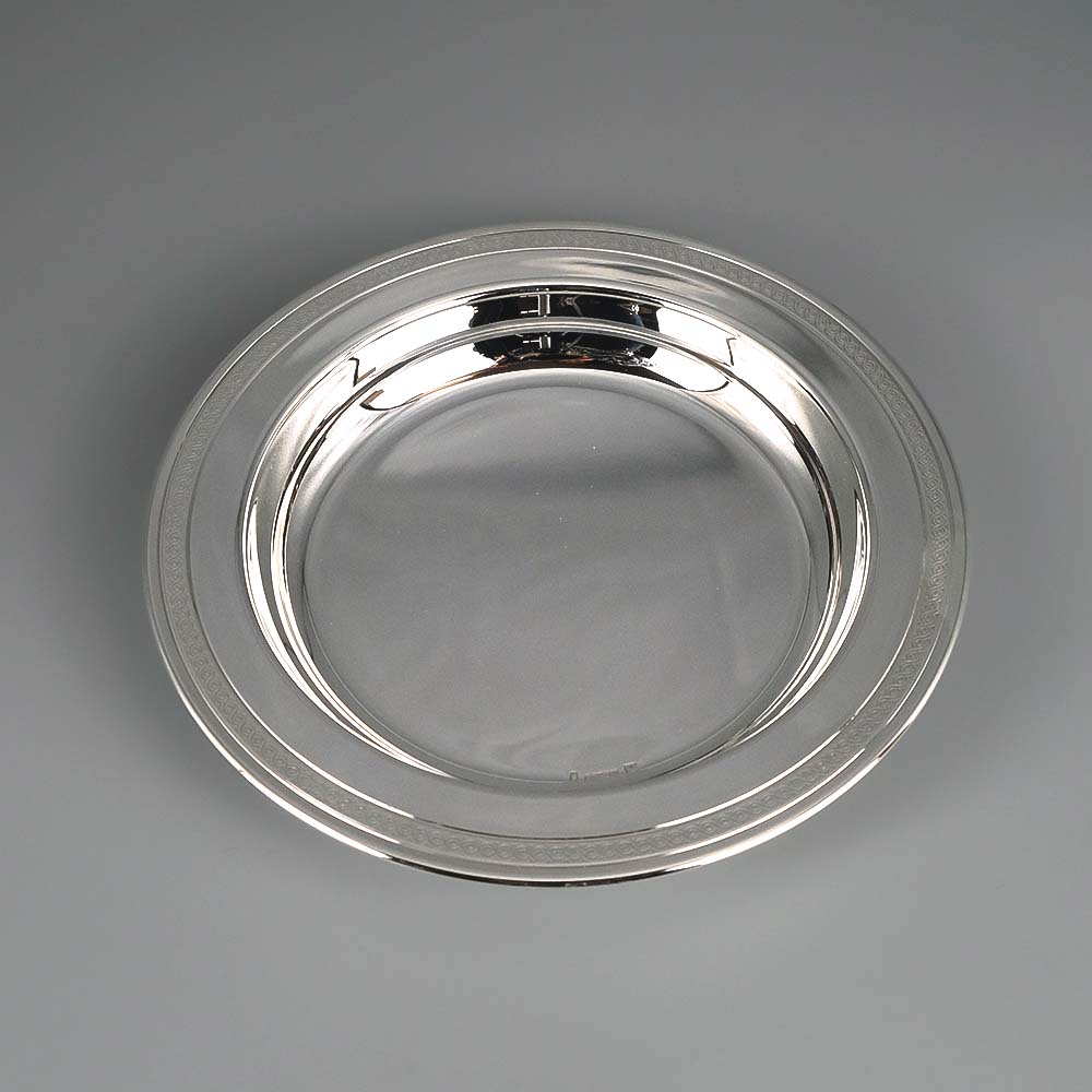 Assiette bébé en argent Entrelas grand format et sa cuillère en argent. Ø 16 cm | H 1.8 cm Un coffret assiette à bouillie en argent avec bordure Entrelas et petite cuillère en argent, idéal à l’occasion d’une naissance ou d’un baptême. Offrez une assiette bébé personnalisée avec la gravure d’un prénom et une date.