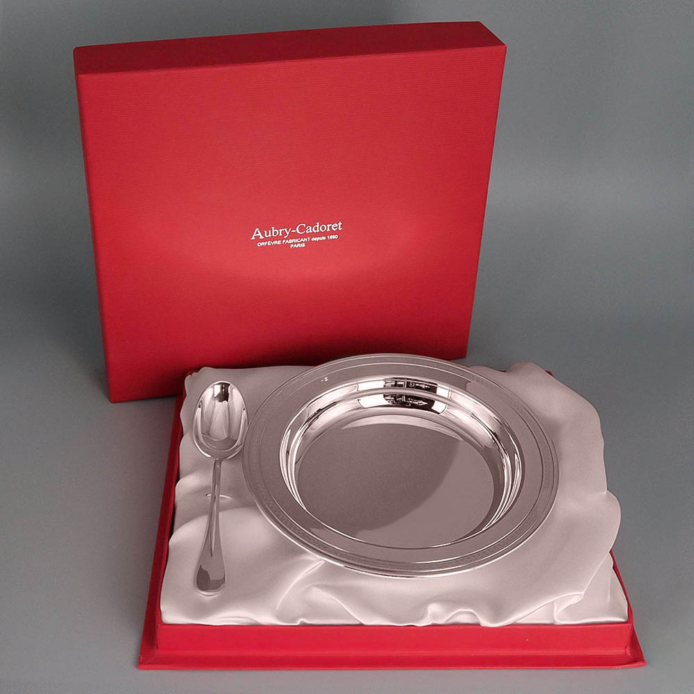 Tous nos coffrets sont gravés et expédiés sous 24h par Colissimo Suivi dans une boîte-écrin siglée de la Maison Aubry-Cadoret. L’assiette à bouillie et la cuillère en argent sont délicatement enveloppées dans un tissu satiné.