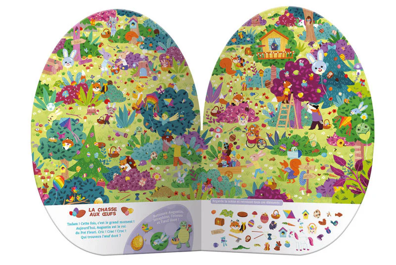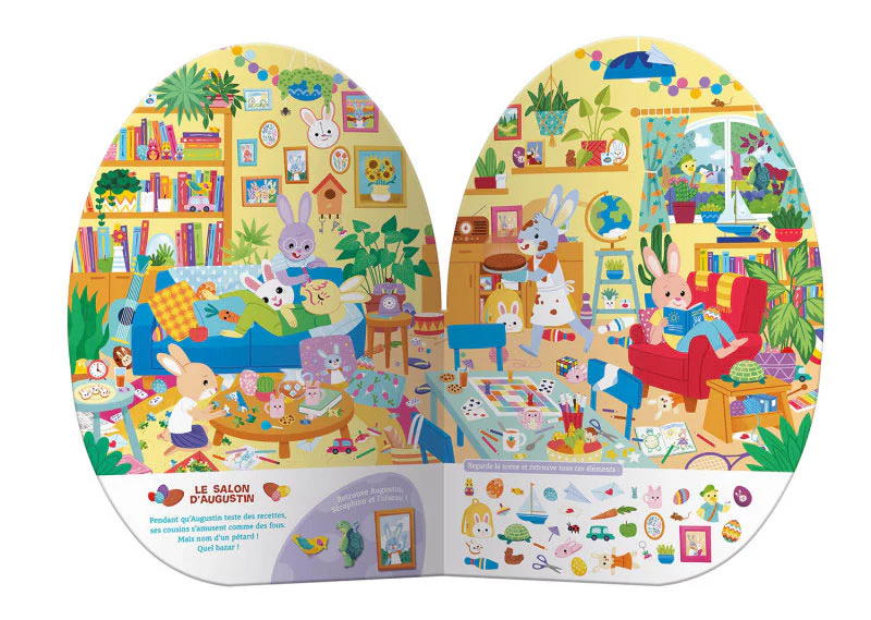 Pâques est bientôt là et Augustin doit préparer la grande chasse aux oeufs du Pré Fleuri ! De son salon à son atelier en passant par le jardin de sa voisine Séraphine, aide le lapin de Pâques à tout organiser.