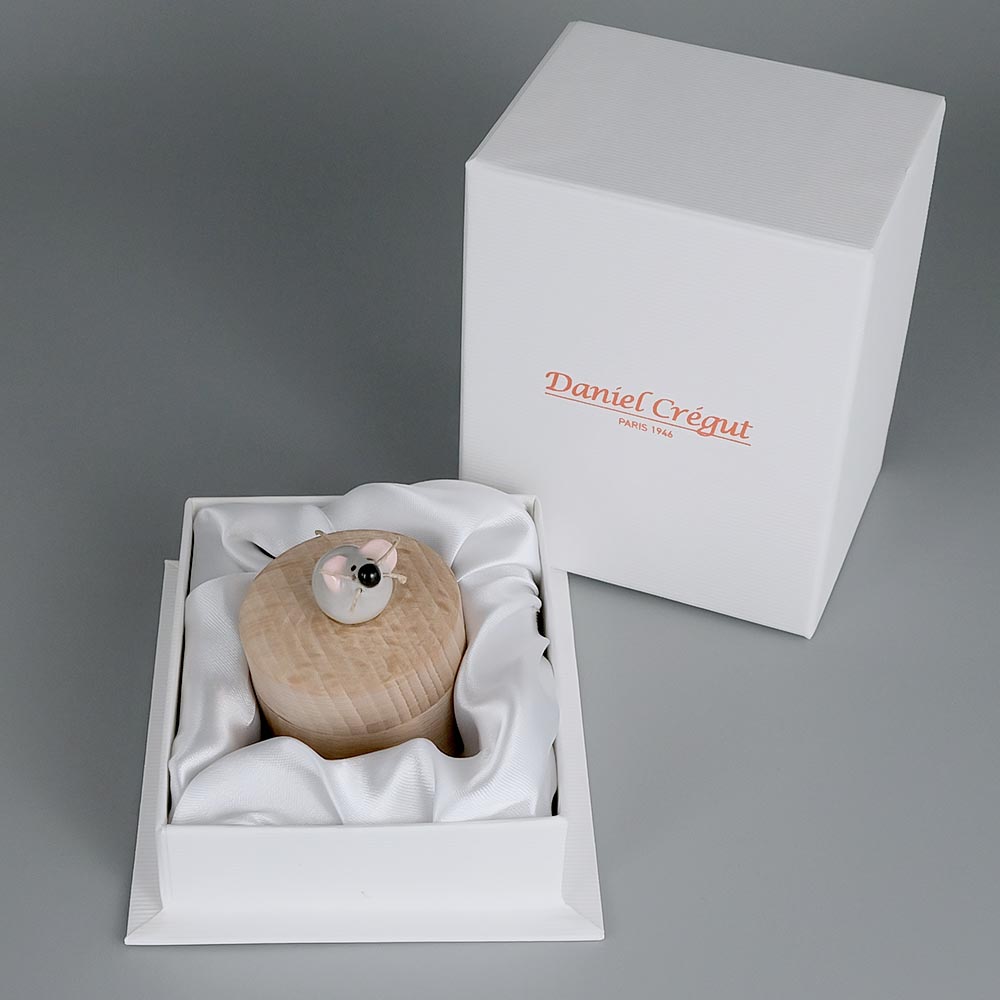 Boite à dents de lait ronde en buis centenaire, tournée à la main par un artisan français. Le couvercle est décoré d’une petite souris en faïence grise fabriquée également à la main.
