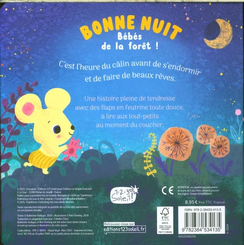 Pensé pour les tout‑petits dès 0 à 3 ans, cet album tendre accompagne l’enfant vers le coucher. Chaque double page met en scène un animal de la forêt qui appelle son petit à se préparer pour la nuit : ranger ses jouets, prendre un bain, enfiler son pyjama, lire une histoire… jusqu’à ce que les petits s’endorment en douceur. Le livre comporte 9 volets en feutrine à soulever (4 grands + 5 petits), apportant un geste ludique et sensoriel basé sur la routine.