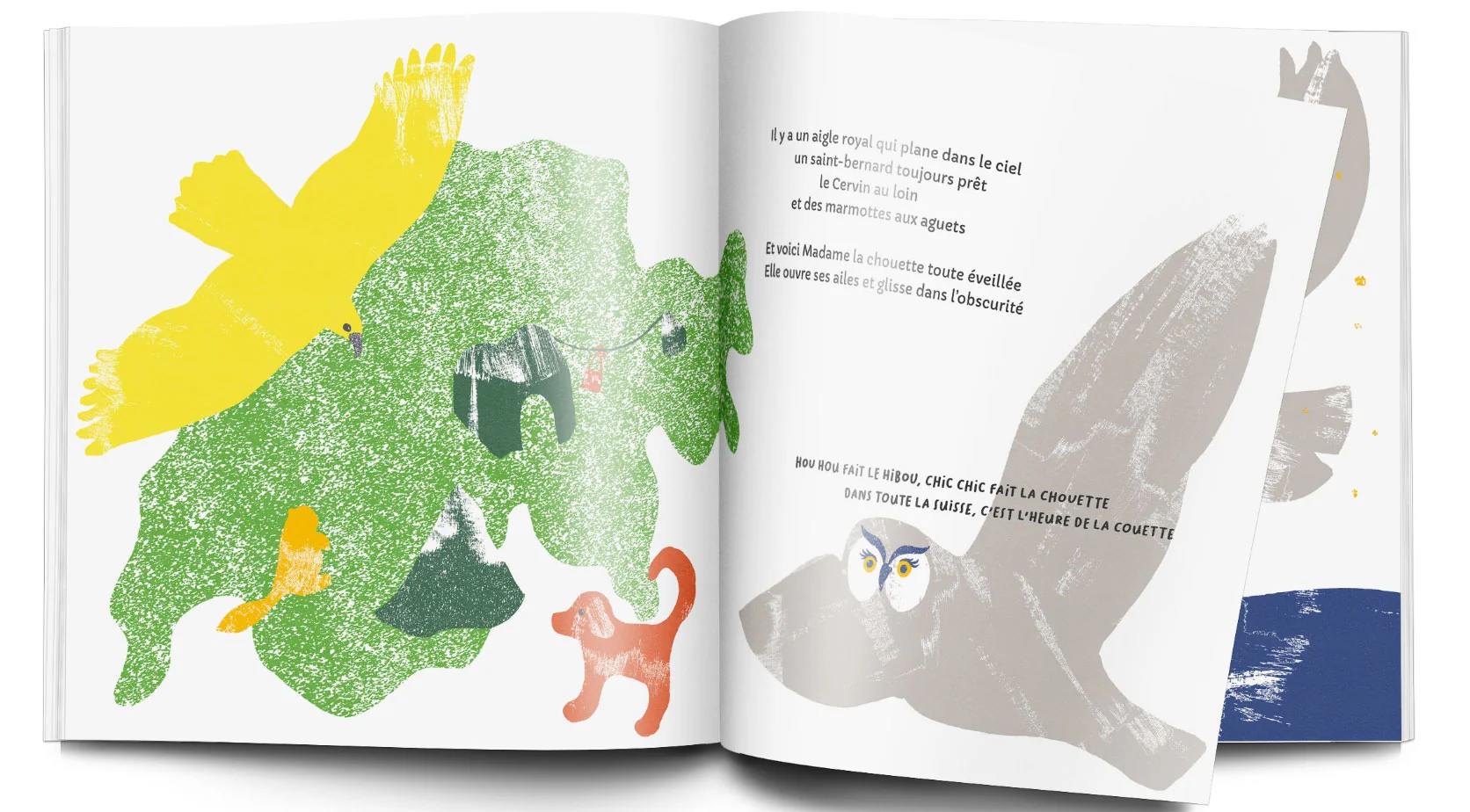 La nuit, la chouette ne dort pas. Elle s’élance et survole la Suisse pour dire bonne nuit au Cervin, aux marmottes et aux vaches, au train à deux étages, à l’Aar et au camion de la voirie qui nettoie nos rues pendant la journée.