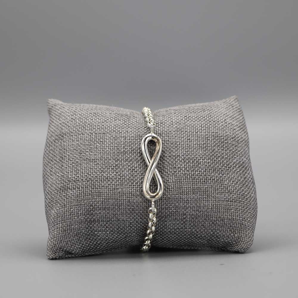 Un bracelet intemporel avec le symbol de l’infini accroché à sa chaîne.