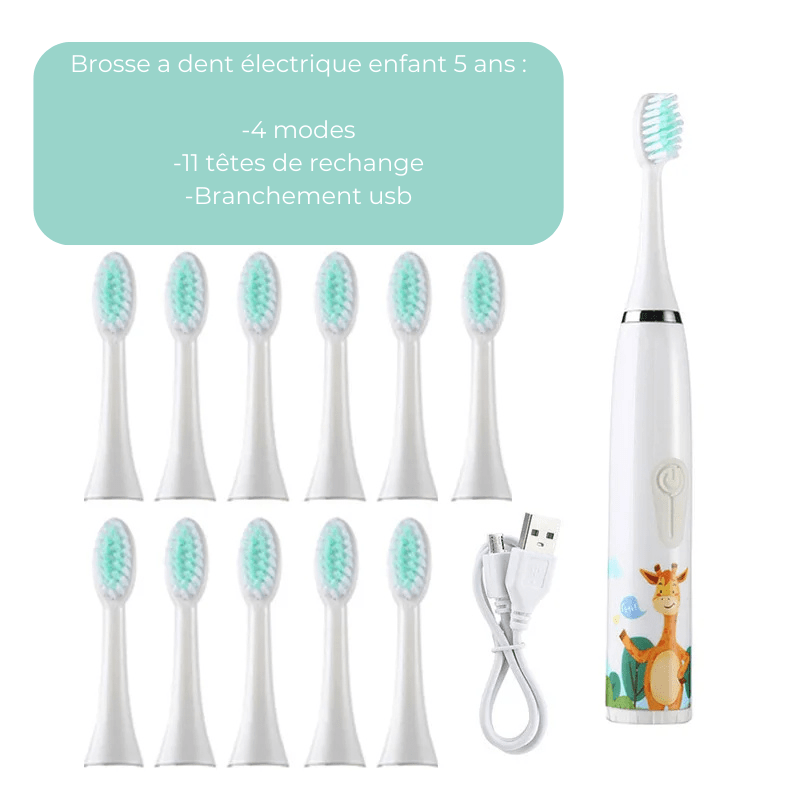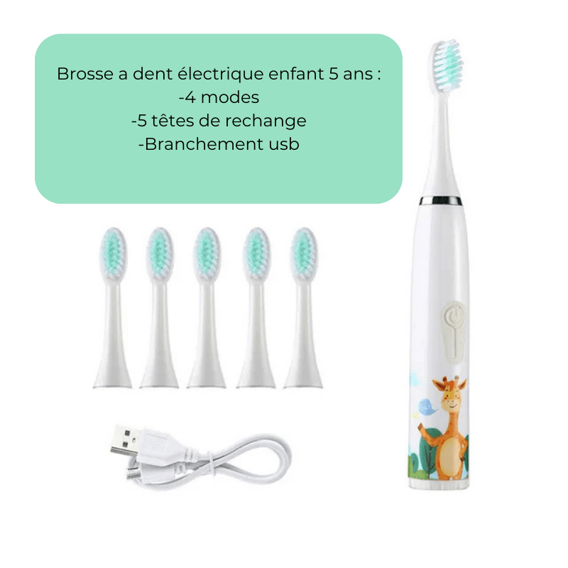 Brosse a dent électrique enfant 5 ans Motif : Animaux, Girafe Incluses : Têtes de rechange Deux modèles au choix Multiples modes de brossage Brosse a dent électrique enfant minuteur