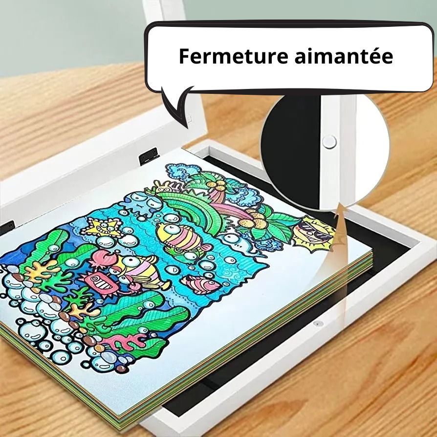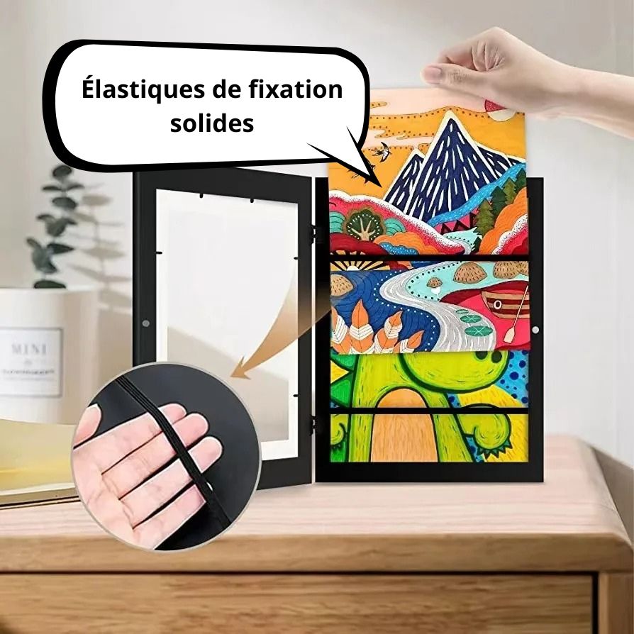 Plus qu’un simple cadre, c’est un véritable outil de développement personnel pour votre enfant. En exposant fièrement ses créations, vous boostez sa confiance en lui et encouragez son expression artistique. Le système d’ouverture magnétique ingénieux permet de changer facilement le dessin exposé, créant ainsi une exposition dynamique qui évolue au fil des créations. Cette rotation simple et rapide devient un rituel excitant pour l’enfant, qui voit ses nouvelles œuvres prendre place d’honneur sur le mur. C’est une façon unique de célébrer ses progrès et de valoriser ses efforts créatifs.