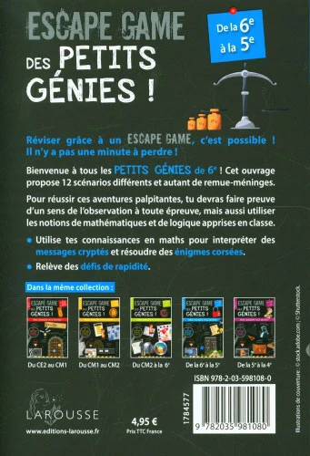 Un petit cahier de jeux pour jeunes proposant 12 scénarios différents d’escape game : pour se sortir de situations d’urgence, l’enfant devra utiliser ses connaissances en maths, son sens de la déduction pour récolter des indices, faire preuve d’un sens de l’observation à toute épreuve, de logique et d’esprit de synthèse…