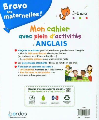 - Des QR codes à scanner pour découvrir 20 comptines et les 300 mots de vocabulaire pour s’entraîner à bien prononcer