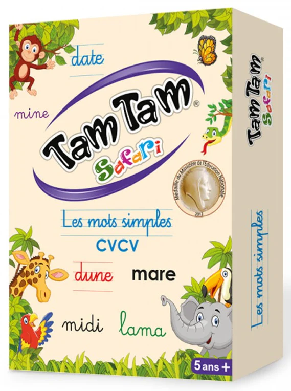 Tam Tam Safari les mots simples est un jeu d’association d’images et de mots permettant d’acquérir ou de renforcer la lecture de mots très simples. Il basé sur les mots cibles utilisés pour l’apprentissage de la lecture avec une structure CVCV (Consonne / Voyelle / Consonne / Voyelle)