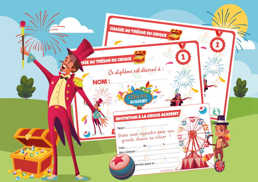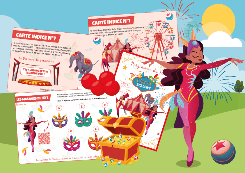 chasse au tresor a preparer a la maisonDans cette chasse au trésor sur le thème du cirque, vis une incroyable aventure à la Circus Academy et retrouve le trésor caché par Monsieur & Madame Loyal. Découvrez un kit de jeu clé en main, idéal pour vos fêtes d’anniversaire et tous vos moments de loisirs en famille (à partir de 1 joueur) !
