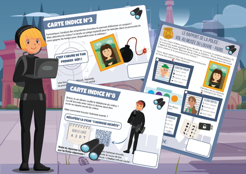 Chasse au trésor des agents secrets. En tant qu’espion d’élite, résous des énigmes, déchiffre des codes, et explore Paris pour retrouver une grande œuvre volée. Il s’agit du célèbre tableau de la Mona Lisa de Léonard de Vinci ! Prépare-toi à plonger dans l’univers fascinant de l’art et de l’histoire tout en mettant à l’épreuve tes compétences d’agent secret. Que la chasse au voleur commence !