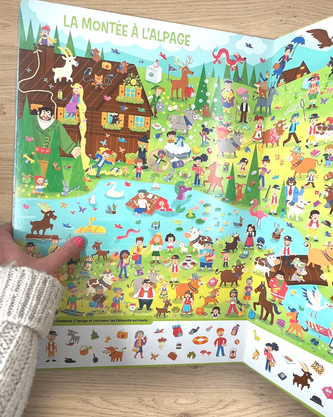 L’enfant découvrira 50 éléments dont 10 personnages récurrents à retrouver à chaque page, 9 univers suisses, traités par des illustrateurs de talent: