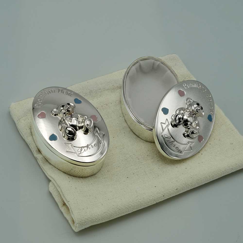 Coffret 1ère Dent & 1ère Boucle de Cheveux : cadeau en métal argenté à personnaliser. Conservez les trésors des premières dents et mèches de cheveux de bébé dans deux jolies boîtes à dents en métal argenté au motif du petit ourson, quelques cœurs pour les décorer