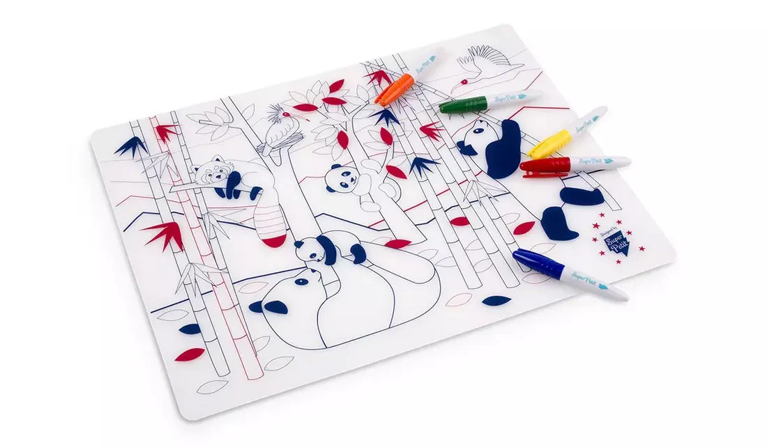 Un set de table en silicone tout doux à colorier proposé avec 5 feutres effaçables à sec : vert – orange – bleu – violet et rouge