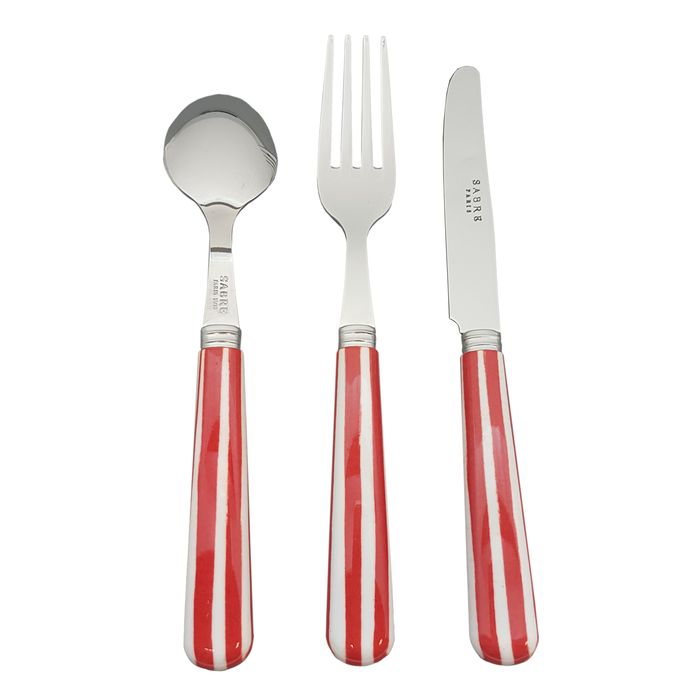 Cuillère bébé inox, fourchette bébé inox et couteau inox 14 cm. Couvert Sabre. De joli couvert bébé inox au motif Transat Rouge.
