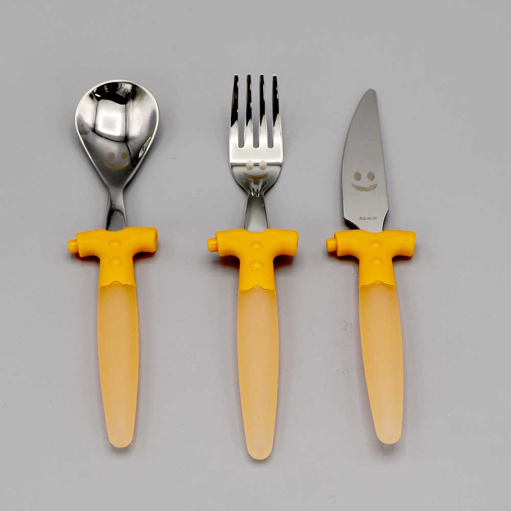 Couverts enfant en inox et résine qui s’imbriquent en se donnant la main.