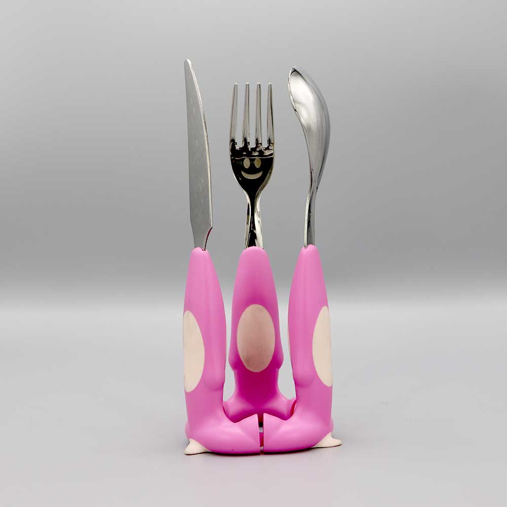 Couverts enfant en inox et résine qui s’imbriquent en faisant la ronde, existe de couleur verte ou rose.