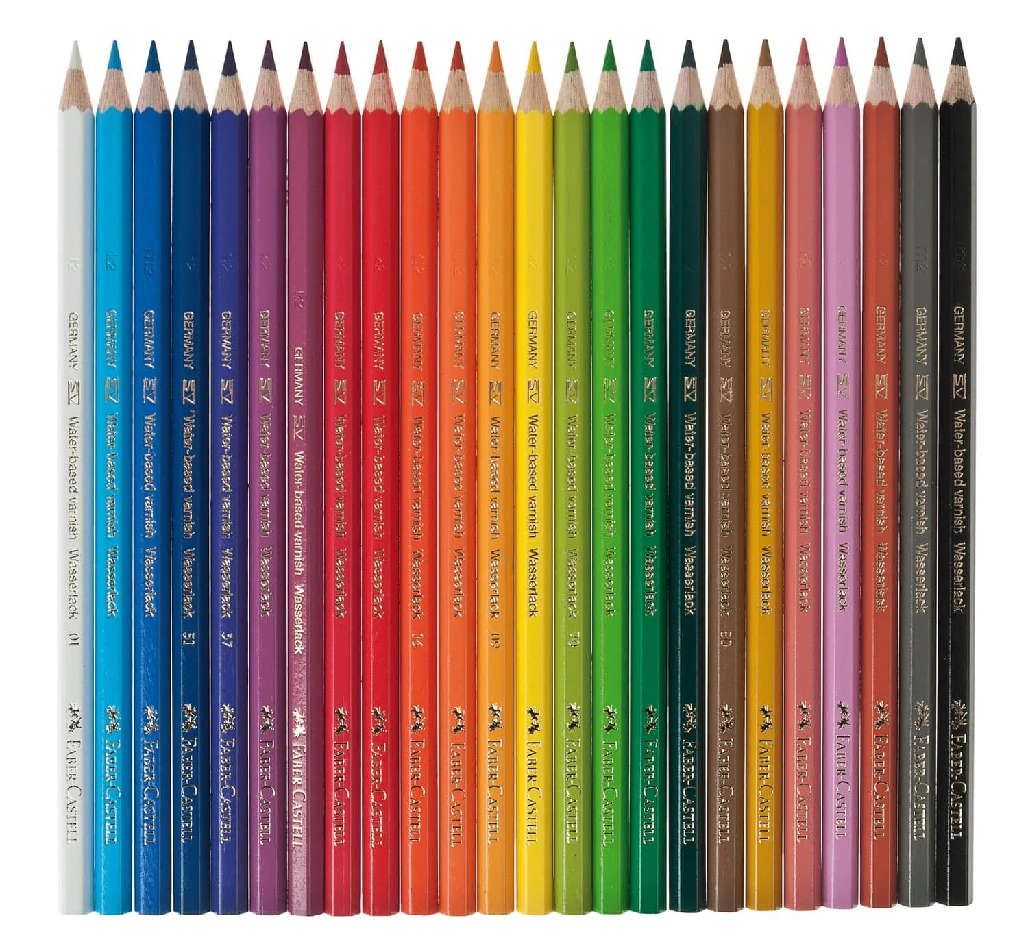 Crayons de couleur en bois pour enfantCes crayons sont très appréciés par les enfants et les artistes pour leur très bonne qualité, ainsi que pour la variété et la haute brillance de leurs couleurs. Forme hexagonale, long. crayon: 175 mmDiam. mine: 3,3 mmPochette de 24 crayonsMarque: Faber-Castel