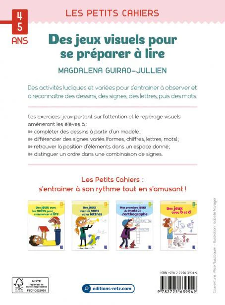 Cahier de lecture Cahier de jeux pour enfant de 4 à 5 ans Ce cahier de jeux pour commencer à lire propose aux enfants des activités ludiques et variées pour s’entraîner à observer et à reconnaître des dessins, des signes, des lettres, puis des mots.Ces exercices-jeux portant sur l’attention et le repérage visuels amèneront l’enfant […]