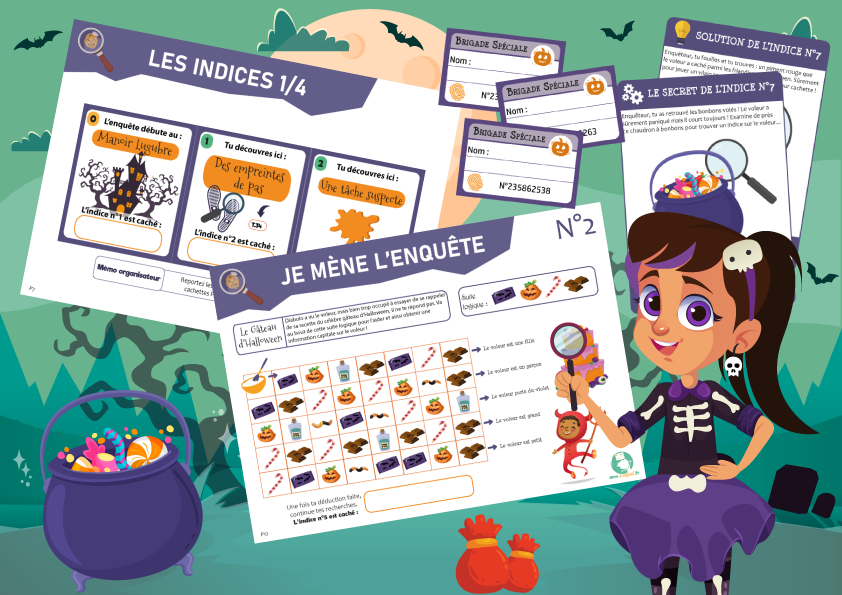 A noter : Ce jeu d’énigme policière d’ Halloween pour enfant à imprimer nécessite également l’organisation et la présence d’un adulte pour son bon déroulement. Nous vous conseillons de très bien cacher les indices dans les différents lieux de la maison pour la recherche et pour un temps de jeu plus long.