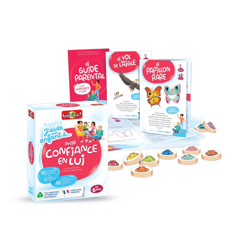 Le coffret d’activités “J’aide mon enfant à avoir confiance en lui” accompagne les parents et leurs enfants dans cette belle aventure : apprendre à se connaître, à s’affirmer et à croire en ses capacités, tout en s’amusant !