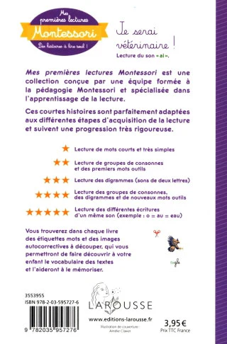 Mes Premières lectures Montessori est une collection conçue par une équipe d’orthophonistes spécialistes de la pédagogie Montessori. Elle propose de courtes histoires adaptées à la progression de l’enfant dès 5 ans (dès qu’il connait le son des lettres) , avec 5 niveaux très progressifs.