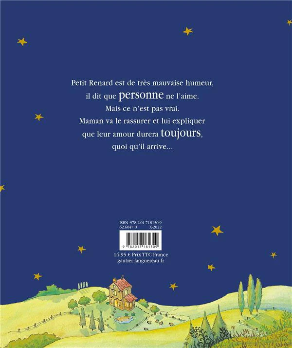 Petit Renard est de très mauvaise humeur. Il dit que personne ne l’aime. Mais ce n’est pas vrai. Maman va le rassurer et lui expliquer que leur amour durera toujours, quoi qu’il arrive…