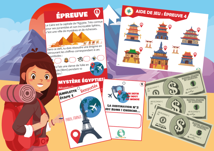 Ce jeu de piste sous forme d’aventure à travers le monde est parfait pour un anniversaire sur le thème du voyage et de la découverte. En effet, inspiré du jeu d’aventure Pékin Express vous trouverez dans notre kit d’animation, tous les supports nécessaires* pour recréer l’esprit et les thèmes principaux des célèbres défis de l’émission. Un jeu de piste aventure ludo-éducatif, basé sur 10 épreuves représentant 10 grandes villes du monde**. Chaque défi réussi permet d’obtenir une amulette qui amène à une nouvelle épreuve (étape). Le but final est de remporter le Trophée des Défis du Bout du Monde et ainsi devenir le ou les vainqueur(s) de la course !