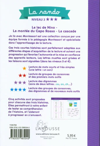 Conçue par une équipe d’orthophonistes spécialistes de la pédagogie Montessori, cette collection propose trois histoires adaptées à la progression de l’enfant dès 5 ans (dès qu’il connaît le son des lettres) , avec 4 niveaux très progressifs.