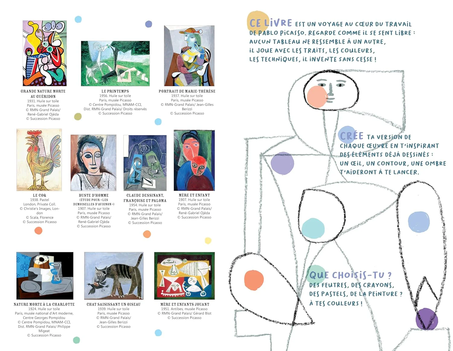 Ce livre est un voyage au cœur du travail de Pablo Picasso. Un cahier spécialement dédié au grand peintre espagnol. Chacune de ses plus belles œuvres est accompagnée de son esquisse à compléter. Des portraits, des animaux et des natures mortes que l’enfant pourra tour à tour dessiner, colorier, peindre, copier ou réinventer.