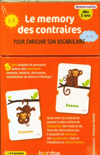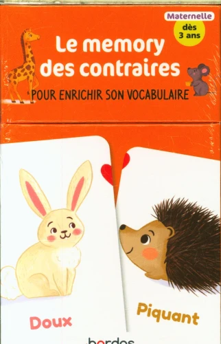 Le jeu Je joue avec les contraires, issu de la collection Récré en boîte des éditions Bordas, est un excellent support pour aider les enfants dès 3 ans à enrichir leur vocabulaire tout en développant leur mémoire. Grâce à ses cartes joliment illustrées, il permet de découvrir de manière simple et ludique les notions de contraires comme chaud/froid, petit/grand, vide/plein…