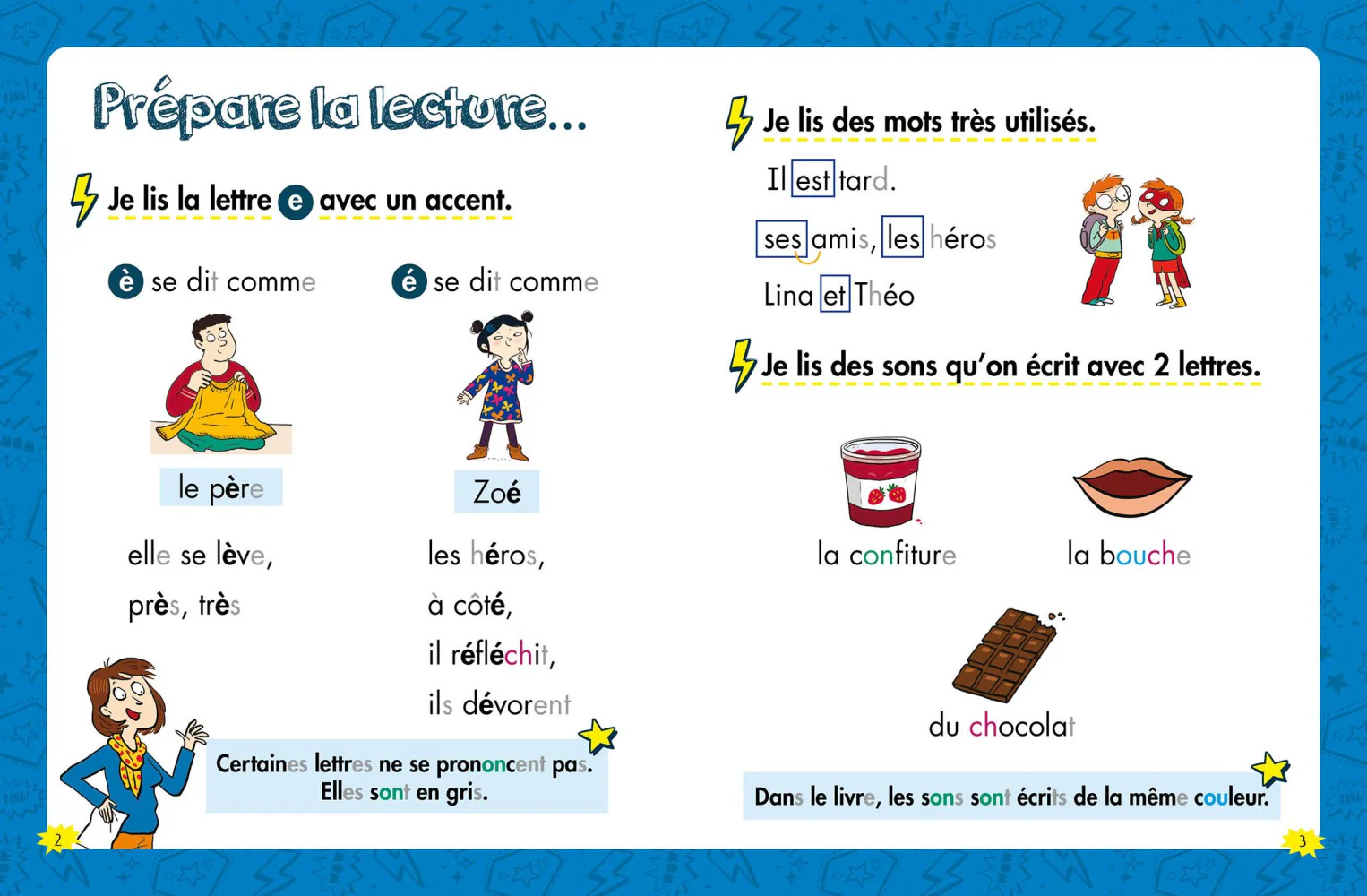 - Une mise en pages adaptée aux apprentis lecteurs : aérée, lettres muettes grisées …