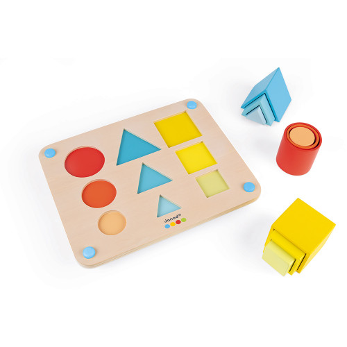 Ce jouet d’éveil en bois est idéal pour apprendre les volumes tout en s’amusant. 3 manières de jouer : encastrer, empiler ou imbriquer ! Un puzzle d’encastrement pour développer la reconnaissance des formes et des couleurs, une fonction pyramide avec empilage des cubes et l’imbrication des pièces pour l’apprentissage des tailles. Très astucieux, le plateau est équipé de pieds antidérapants en silicone pour plus de stabilité. Ce jouet d’éveil permettra de développer la motricité fine, la découverte des formes et des couleurs et la construction visuo-spatiale. Les pièces sont peintes à l’eau.