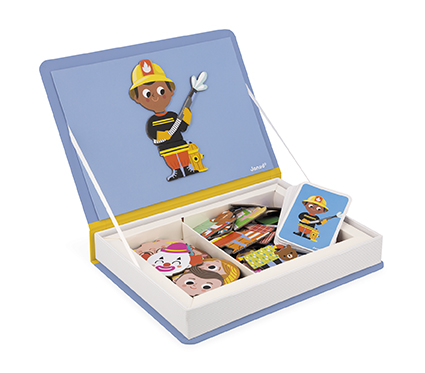 Et si on jouait à inventer des métiers ? Quelle sera l’association la plus étonnante créée par les enfants ? Avec ce Magnéti’Book dédié aux métiers, les enfants à partir de 3 ans vont pouvoir découvrir 16 professions mais également en imaginer plein d’autres ! Les Magnéti’Books sont des coffrets aimantés renfermant de nombreux magnets à positionner sur une surface magnétique. Dans un premier temps, les enfants peuvent s’amuser à reconstituer les cartes modèles en retrouvant les bons éléments et en les plaçant au bon endroit. Ensuite, ils pourront laisser parler leur imagination et créer leur propres mélanges de métiers en mixant les aimants ! Pratique, le coffret se referme facilement et contient les 48 magnets et 16 cartes du jeu, pour être transporté partout ! Ce jeu éducatif magnétique est fabriqué en carton FSC®.
