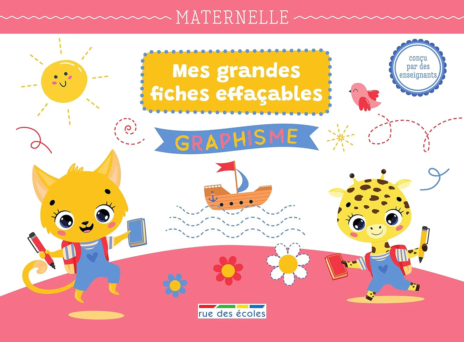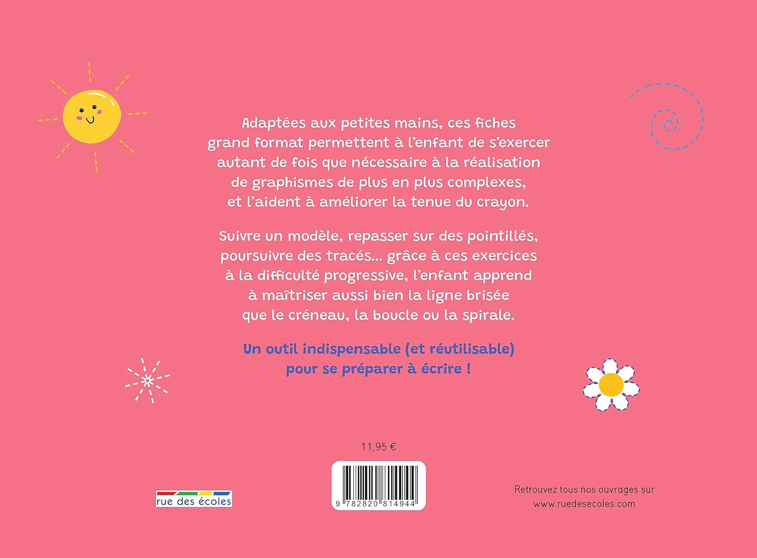 AdaptĆ©es aux petites mains, ces fiches grand format permettent Ć l’enfant de s’exercer autant de fois que nĆ©cessaire Ć la rĆ©alisation de graphismes de plus en plus complexes, et l’aident Ć amĆ©liorer la tenue du crayon.