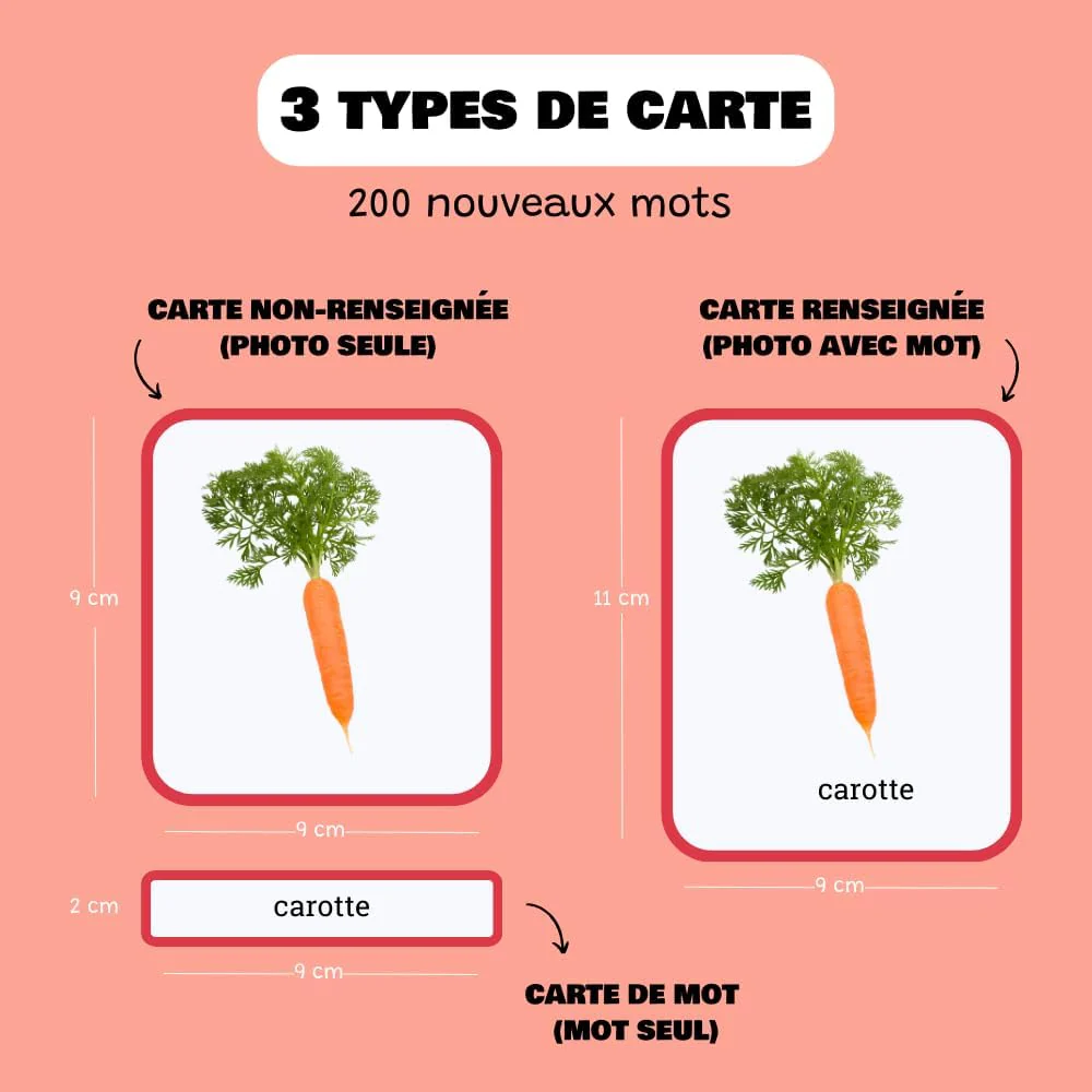 Coffret de 30 nouveaux mots (soit 90 cartes évolutives) pour apprendre à nommer les objets du quotidien.