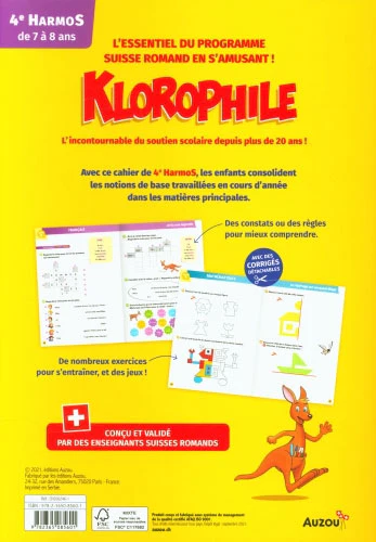 Klorophile propose aux enfants de 7 à 8 ans, un gros cahier de soutien scolaire de 116 pages pour faire des exercices de français, d’écriture et de maths ainsi que des jeux basés sur le programme romand de 4ème.