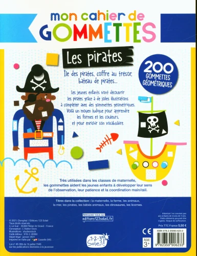 Avec ses grandes gommettes faciles à coller et ses décors pleins de surprises, Mon cahier de gommettes – Les pirates invite les enfants à voguer sur les océans à la recherche de trésors cachés. Bateau, perroquet, sabre, carte au trésor… chaque page est une mission à compléter !