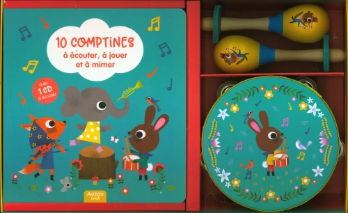 Le coffret comprend un petit livret avec les paroles des comptines, un tambourin et deux maracas en bois.