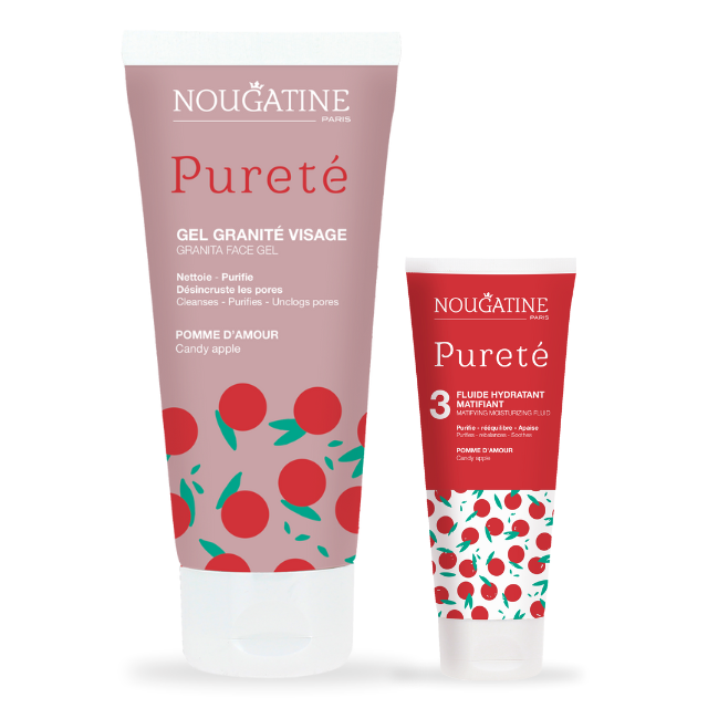 Nouveauté ! Une routine quotidienne en 2 étapes pour nettoyer, purifier, hydrater et matifier ta peau. Parfum Pomme D’amour. À partir de 10 ans.