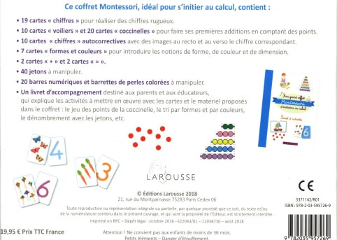 - un livret d’accompagnement destiné aux parents et aux éducateurs, qui explique les activités à mettre en oeuvre avec les cartes et le matériel proposés dans le coffret : le jeu des points de la coccinelle, le tri par formes et par couleurs, le dénombrement avec les jetons, etc.